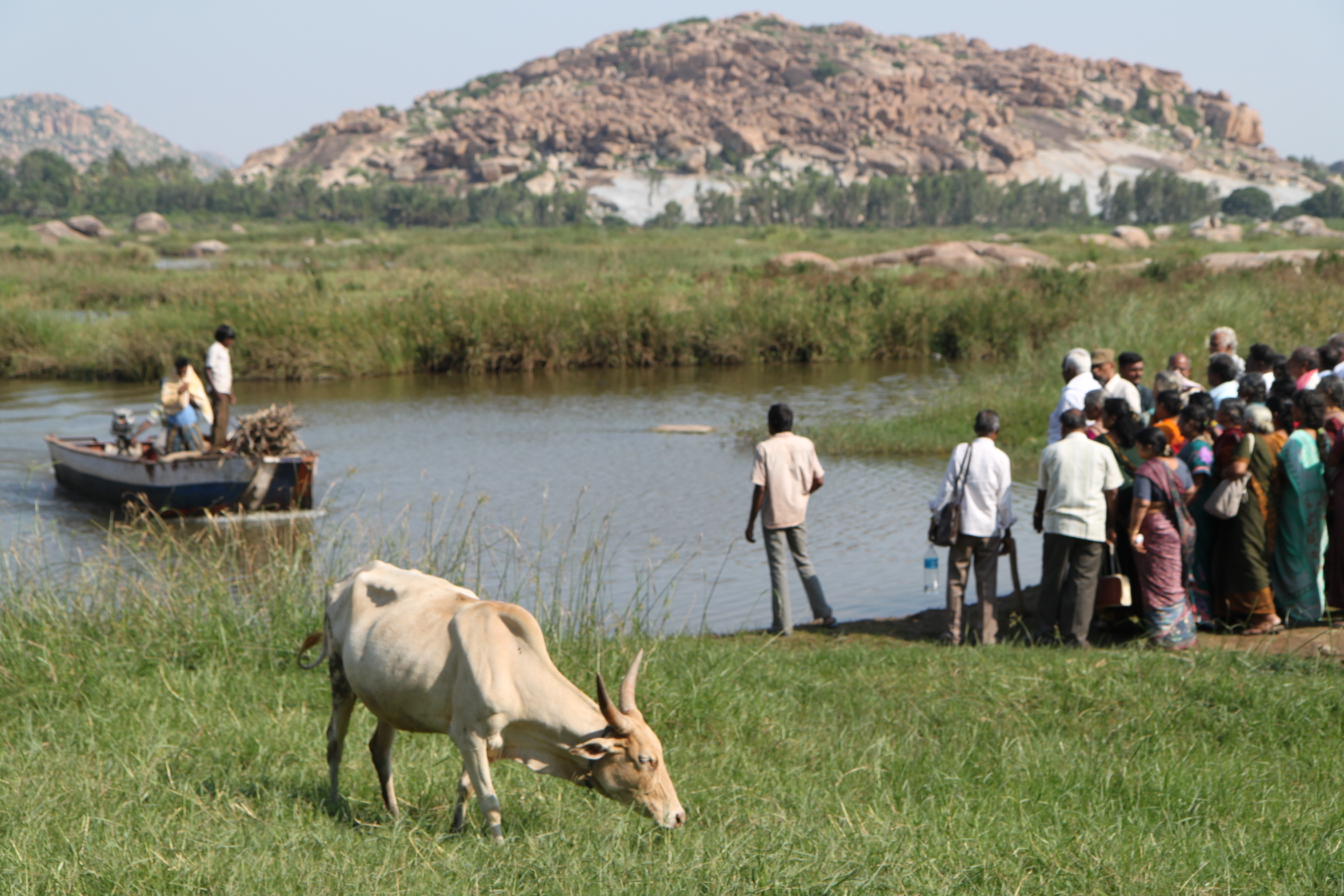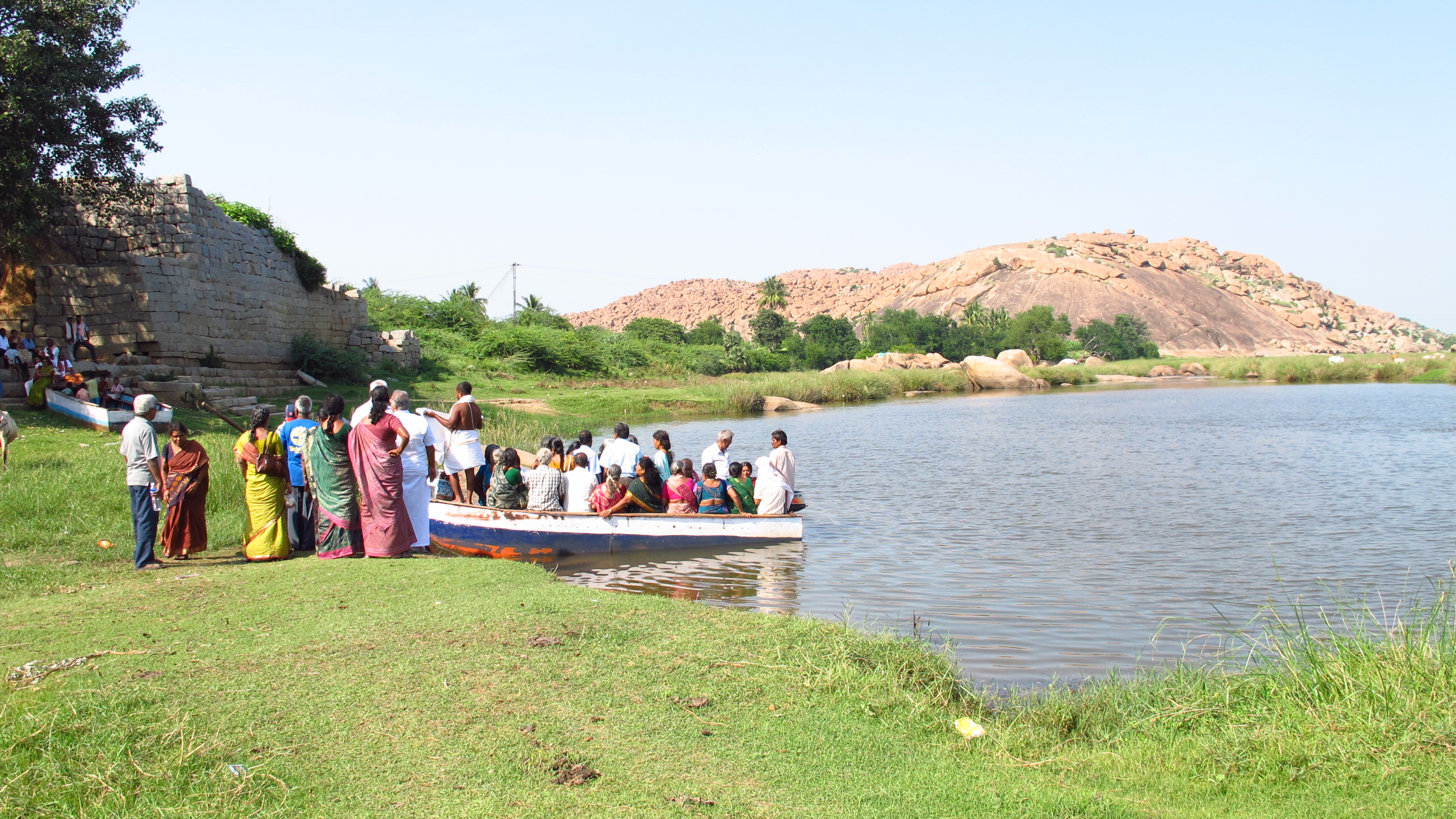 I had picked a guesthouse across the river just outside of Hampi, in Virupapur Gaddi, so I was required to get a boat. This did in fact end up being a Coracle, a boat shaped like a huge contact lens, made from what looked like banana palm leaves and bamboo covered in tar. It meant that everyone wanting to get into it had to get in in a certain order and position ourselves so that we didn’t tip the floater over as we got into it!