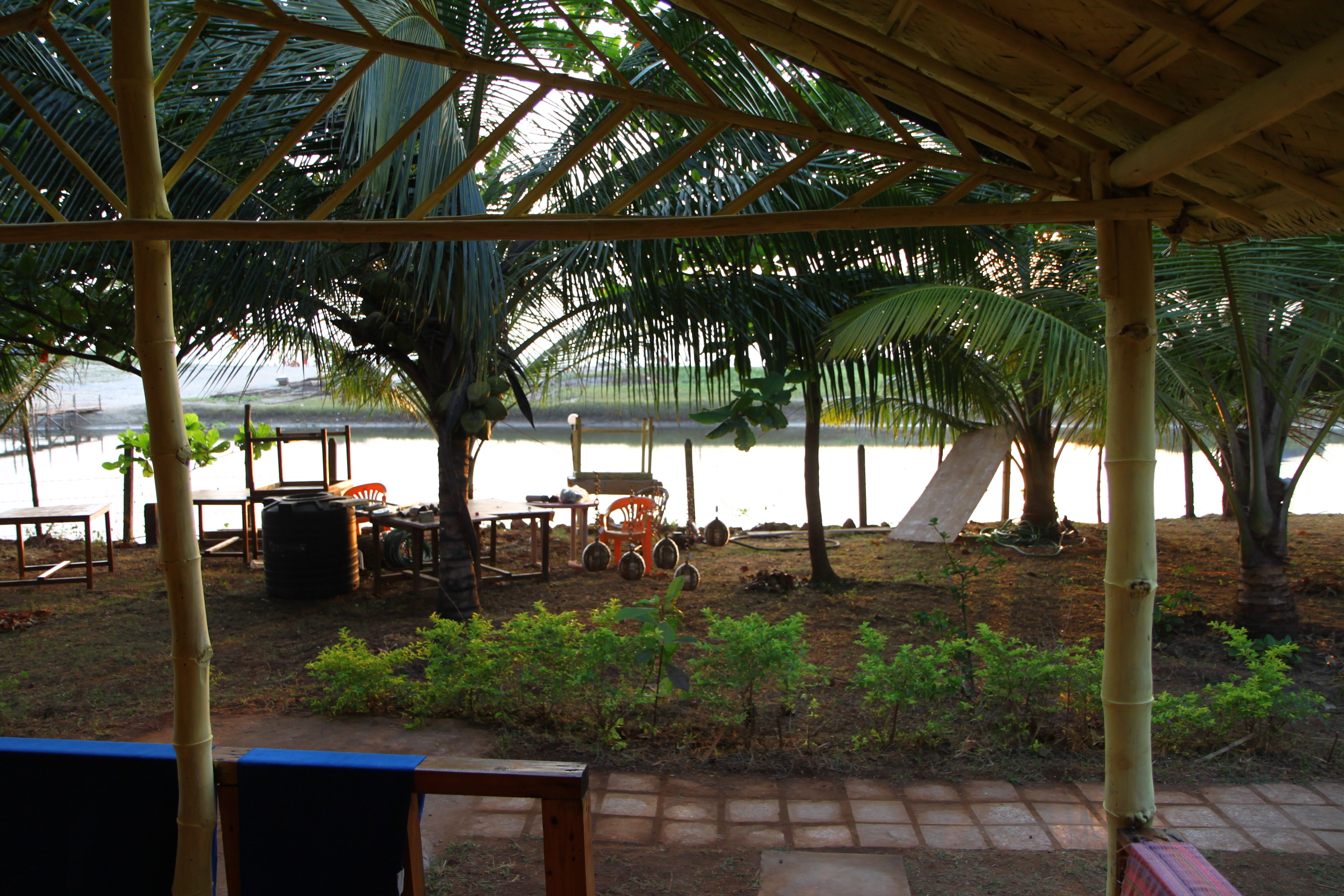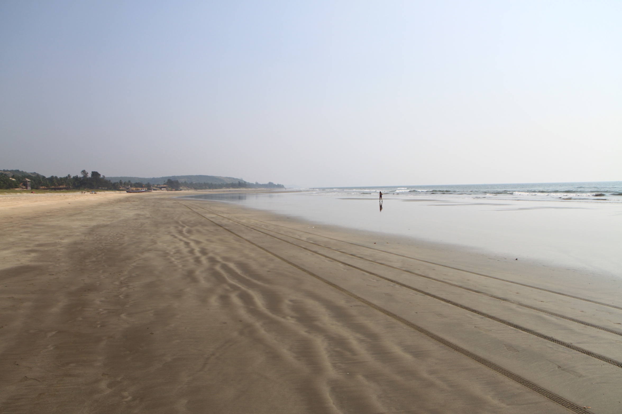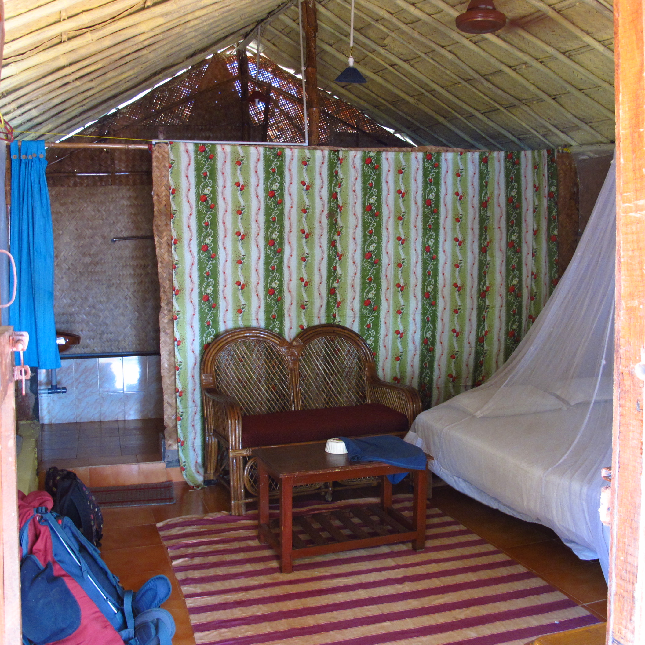 I had to catch a bus to Mapusa (pronounced Map-sa) and then change there to get on another to Mandrem. I got off in what appeared to be the middle of nowhere and walked to the first place I could see that offered rooms. They are gorgeous! There are two types of huts available: ground and ones on stilts. I am in a normal ground level hut that has a spacious room and a large bathroom, with HOT WATER! The main room has a lovely big bed and a sort of wicker sofa with a coffee table, a pretty rug and a huge mirror to look at your lovely tan in! They provide their own bug-plug for the mosquitos and a net.