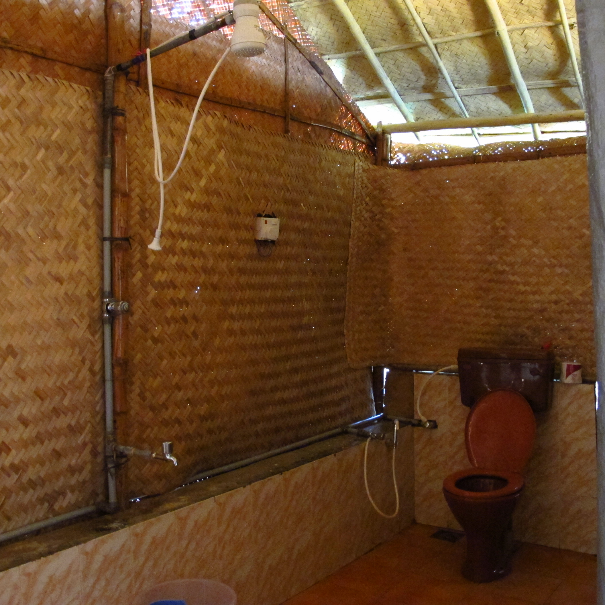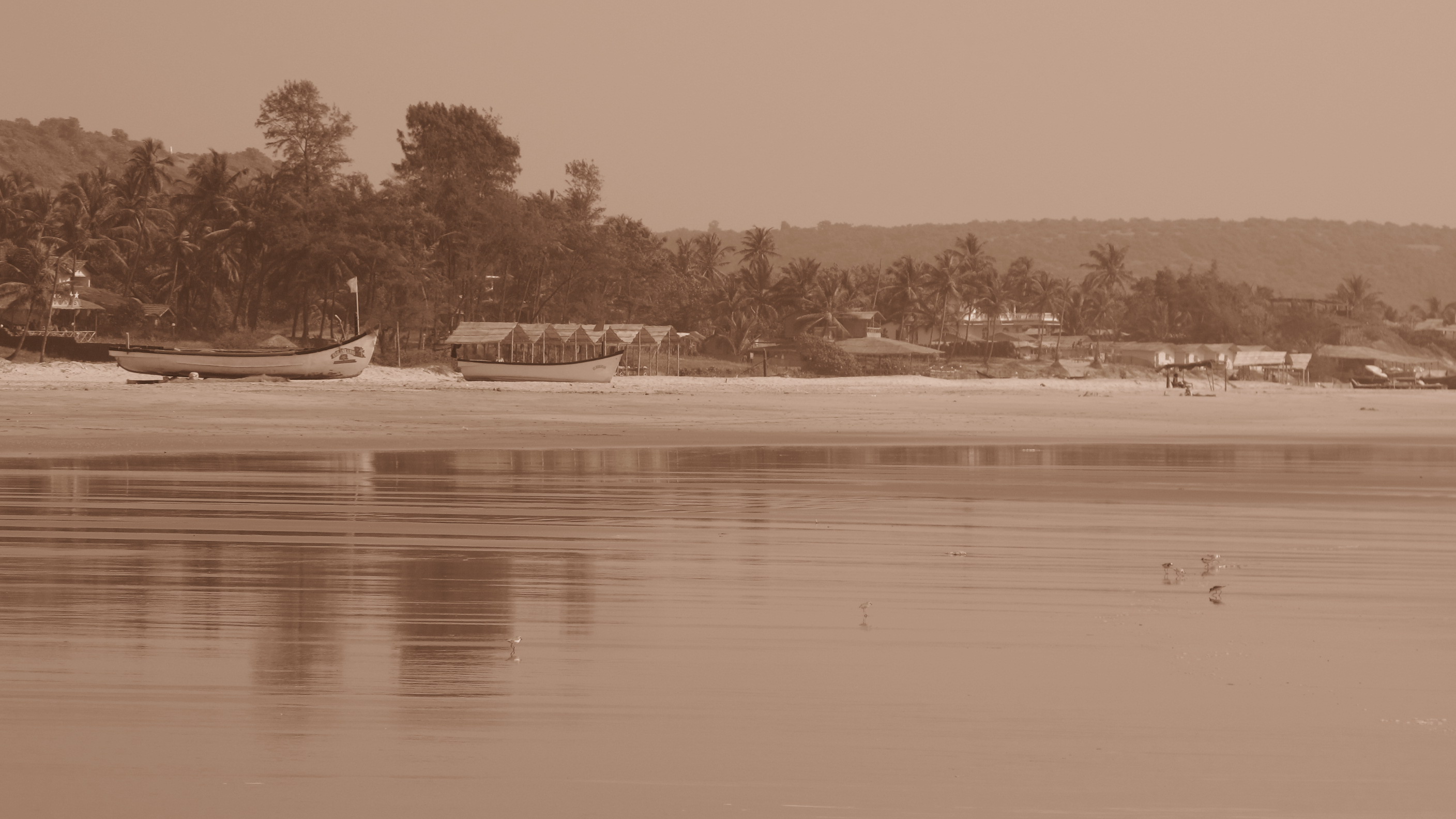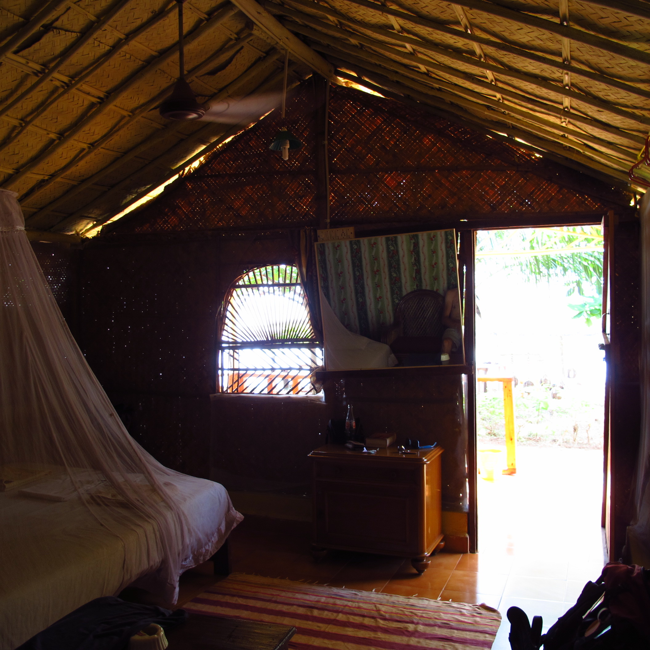 I had to catch a bus to Mapusa (pronounced Map-sa) and then change there to get on another to Mandrem. I got off in what appeared to be the middle of nowhere and walked to the first place I could see that offered rooms. They are gorgeous! There are two types of huts available: ground and ones on stilts. I am in a normal ground level hut that has a spacious room and a large bathroom, with HOT WATER! The main room has a lovely big bed and a sort of wicker sofa with a coffee table, a pretty rug and a huge mirror to look at your lovely tan in! They provide their own bug-plug for the mosquitos and a net.