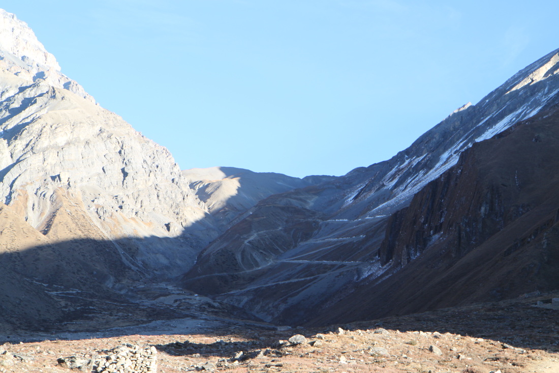 I managed to get to the village of Humde, a sort of halfway point, and have a lunch of veg fried noodles. I decided to read the section on ‘AMS’ (Acute Mountain Sickness) in the Lonely Planet as I was still feeling rubbish…bad move! I then worried myself into a bit of a panic…and then worried myself out of it again…It says to worry if ‘…you wake up with a splitting headache, nausea, vomiting and a bad, dry cough, if you feel breathless on exertion and very tired…’ I merely woke up with a bit of a headache…I think maybe that I had a headache due to the cold weather and me getting a cold as opposed to me actually getting AMS!
