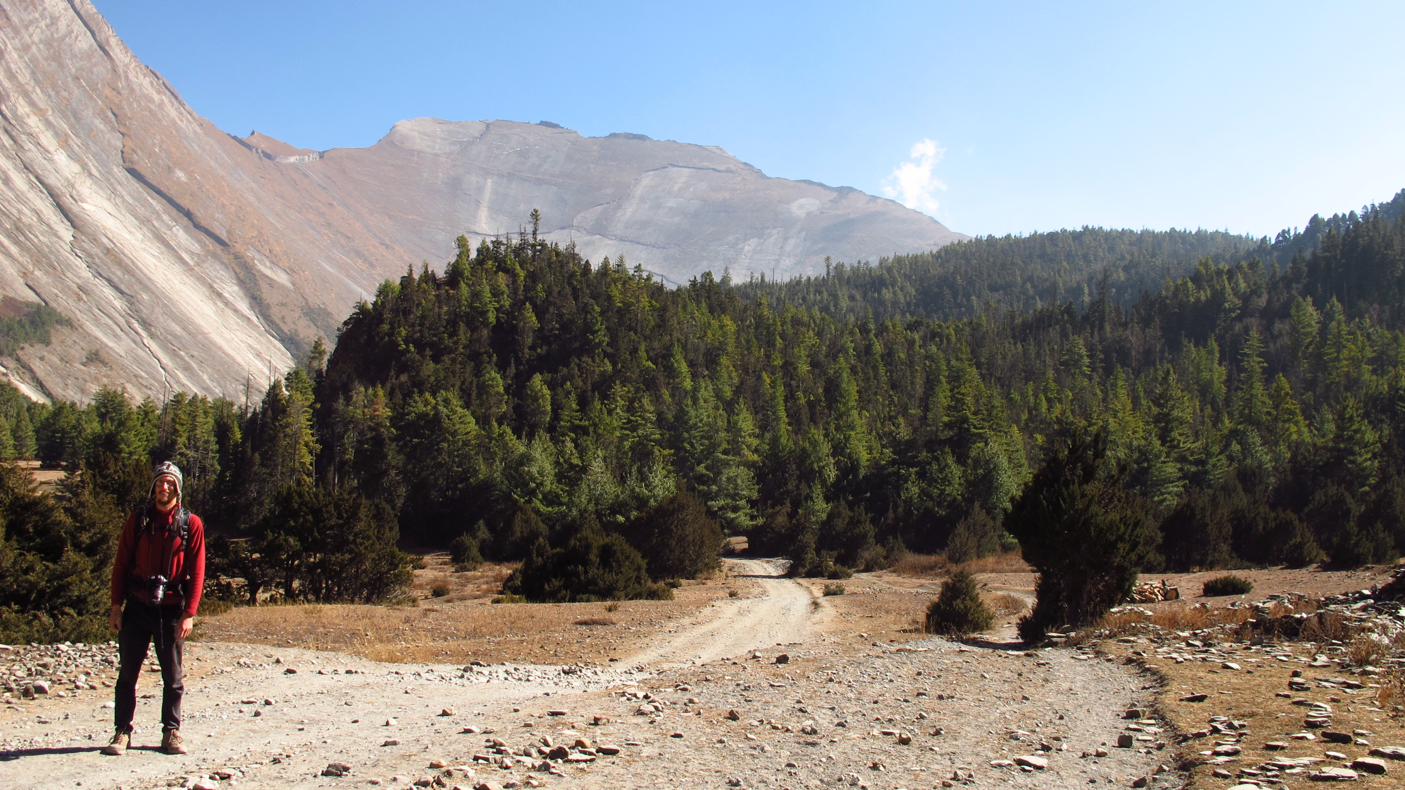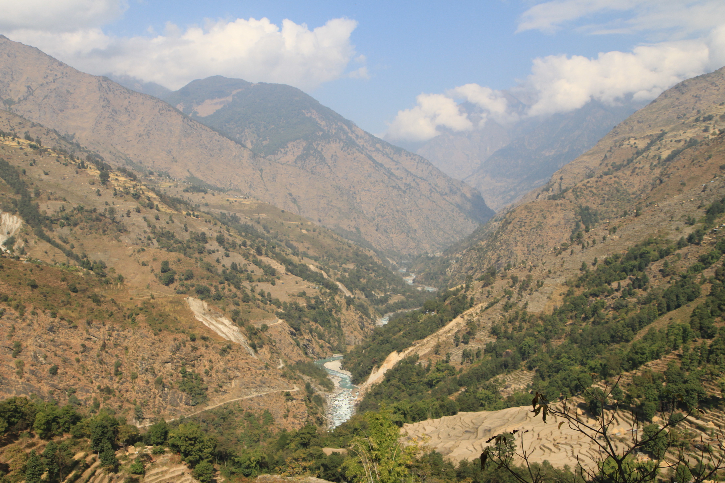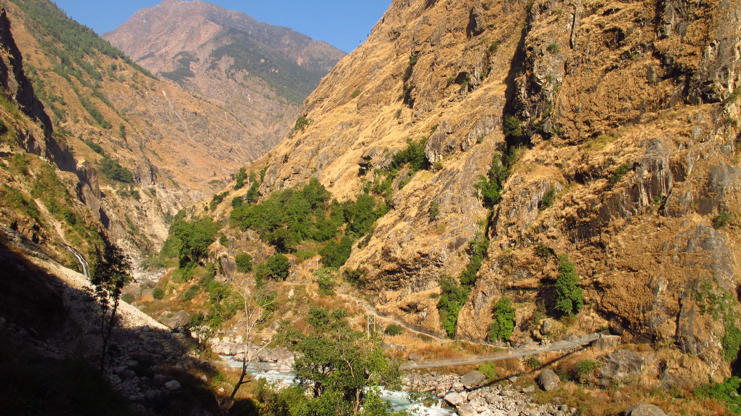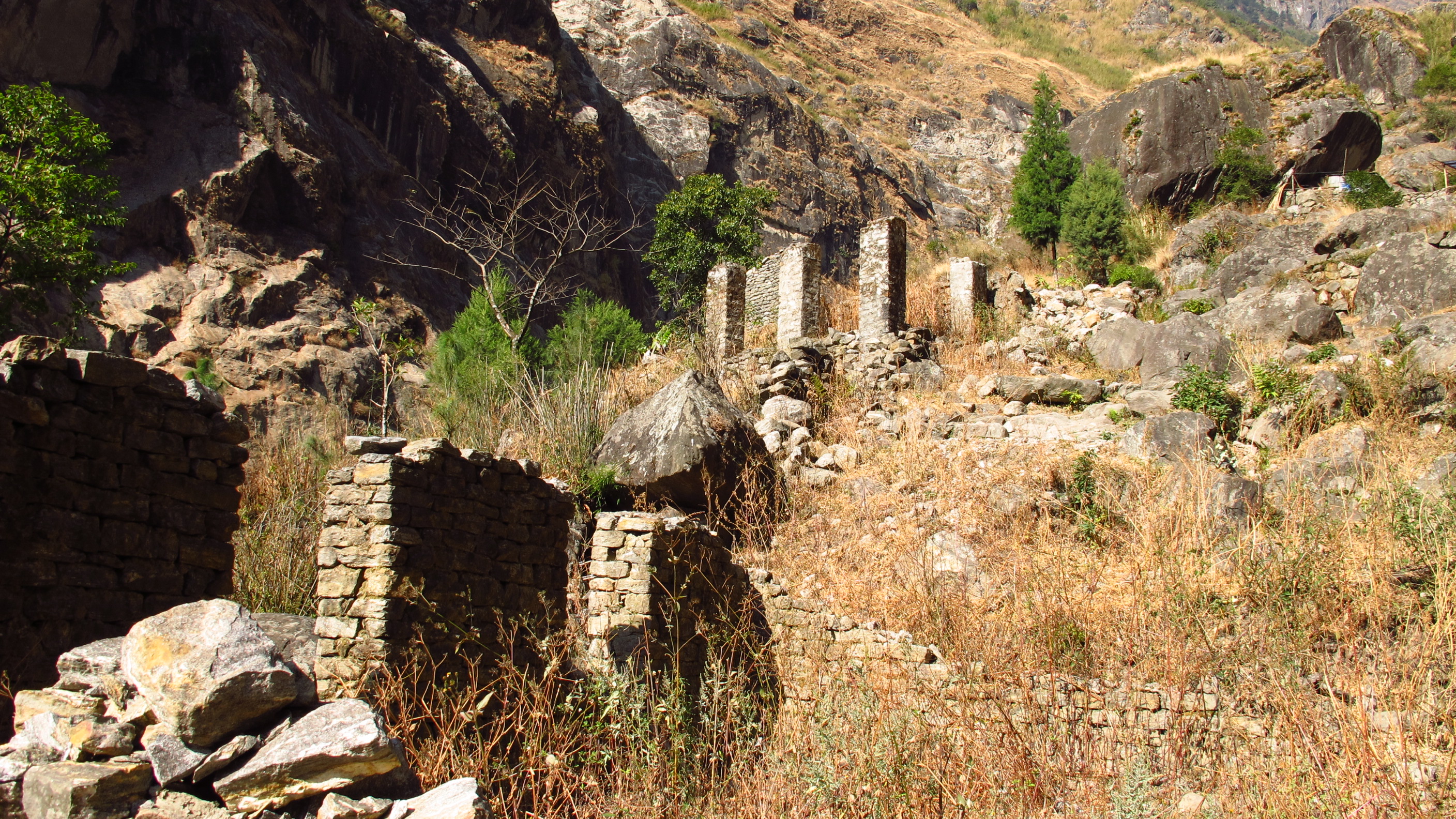 I was up and out by 7.30am today and quickly walking up the hills to Bhratang and beyond towards Dukhure Pokhari. Part of the walk today had me walking along a ridge above a near vertical slope that drops sheer to the river. This is, at the moment, only a trekking trail but they are widening it so that it will become a jeep trail. I think that this is good, as so far people can only walk to the nearest hospital or to the next village for supplies etc…