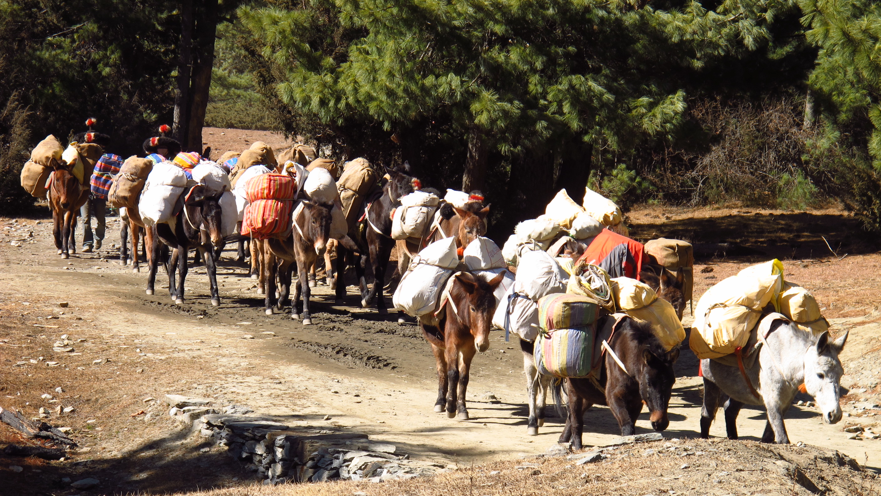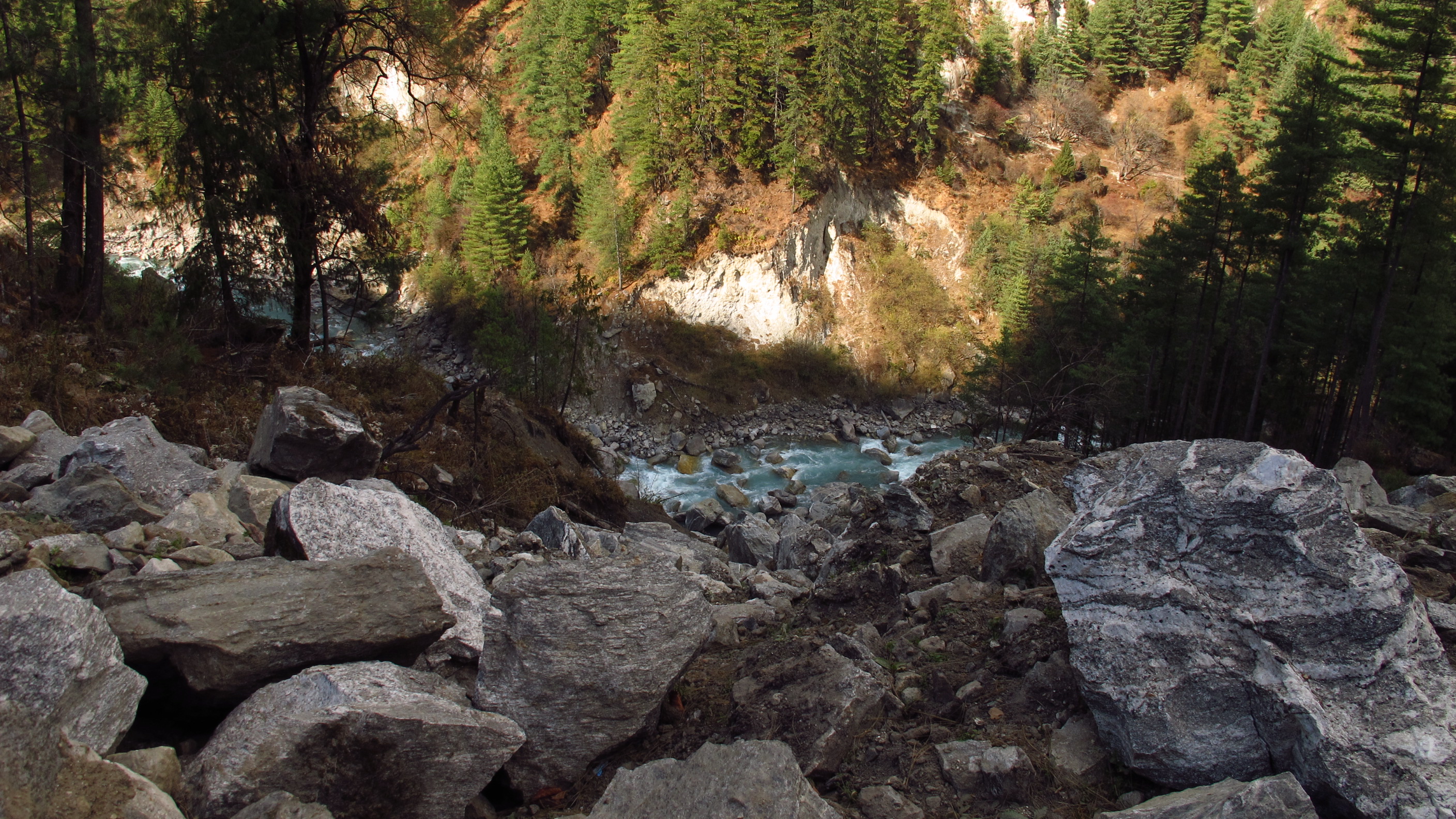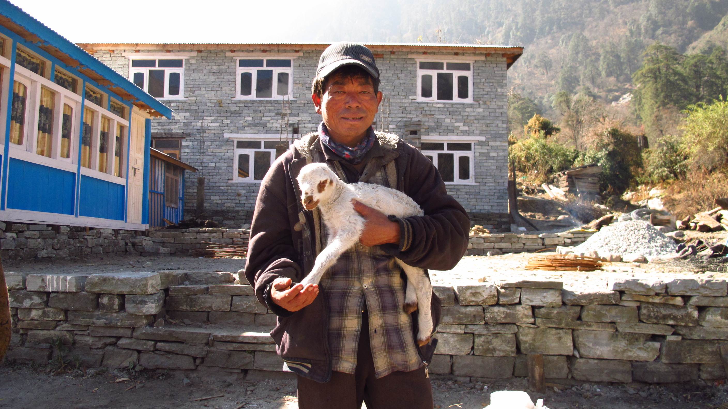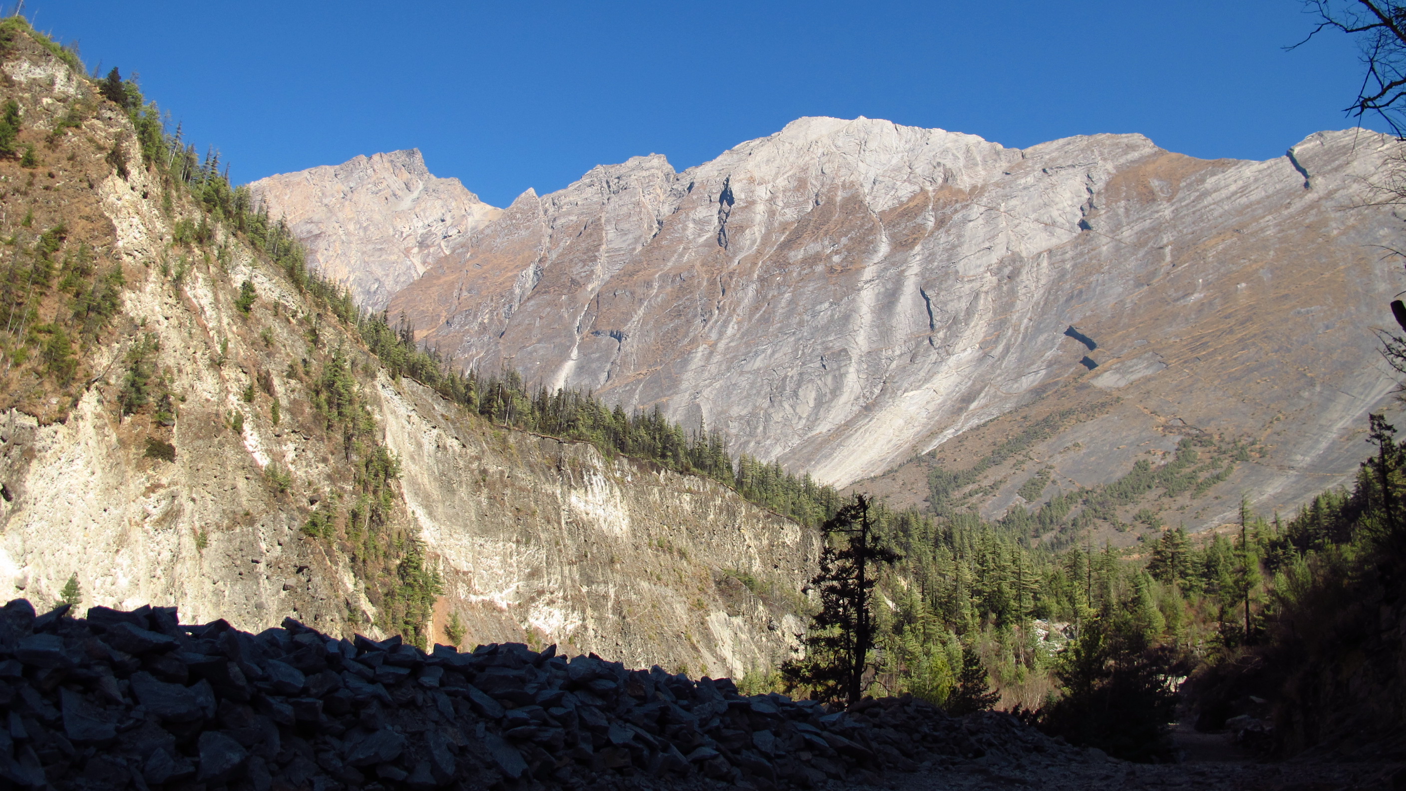 I was up and out by 7.30am today and quickly walking up the hills to Bhratang and beyond towards Dukhure Pokhari. Part of the walk today had me walking along a ridge above a near vertical slope that drops sheer to the river. This is, at the moment, only a trekking trail but they are widening it so that it will become a jeep trail. I think that this is good, as so far people can only walk to the nearest hospital or to the next village for supplies etc…