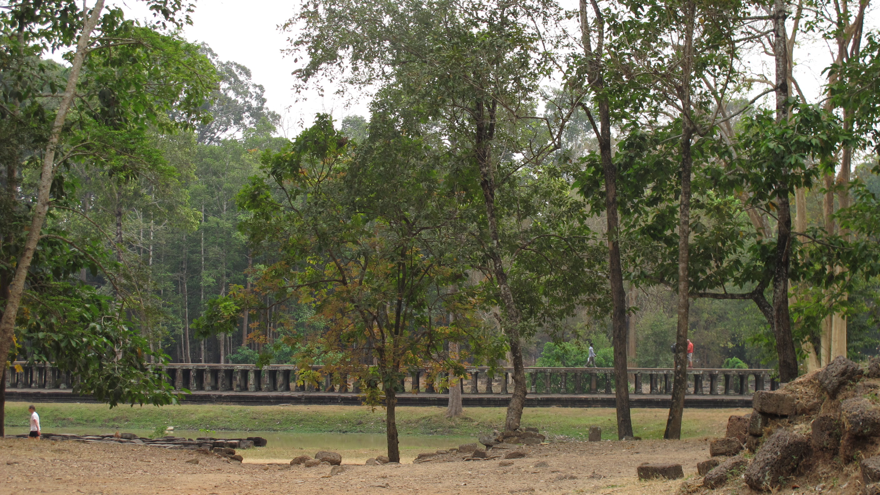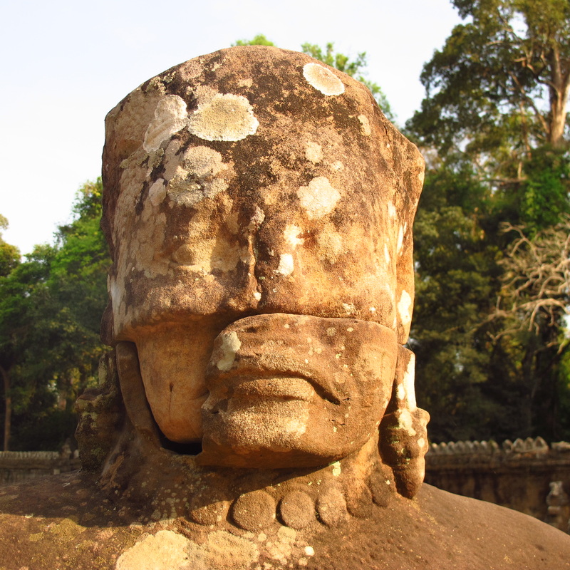Angkor Thom, which literally means Great City, was the last and most enduring capital city of the Khmer Empire. It was established in the late twelfth century by king Jayavarman VII. It covers an area of 9 km, within which are located several monuments from earlier eras as well as those established by Jayavarman and his successors. At the center of the city is Jayavarman’s state temple, the Bayon, with the other major sites clustered around the Victory Square immediately to the north. Within the city of Angkor Thom was a system of canals, through which water flowed from the northeast to the southwest. The bulk of the land enclosed by the city walls would have been occupied by the secular buildings of the city, of which nothing remains. This area is now covered by forest.