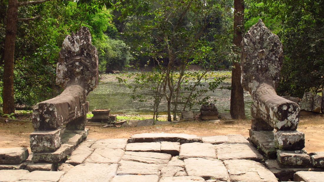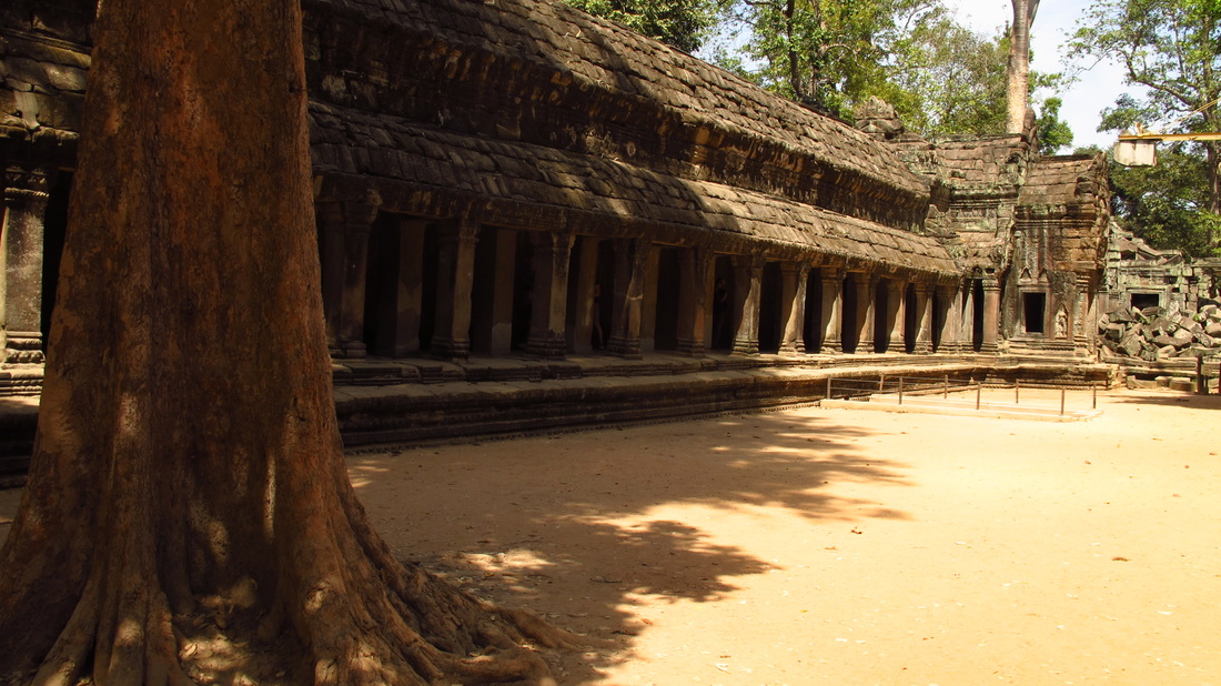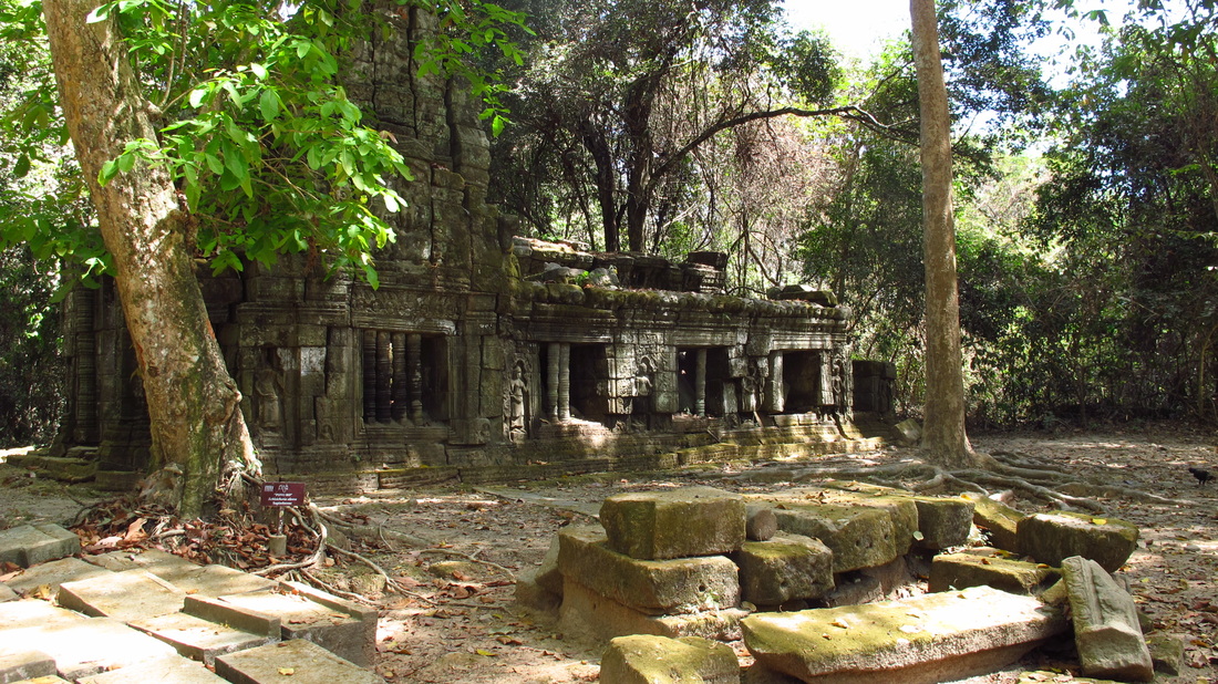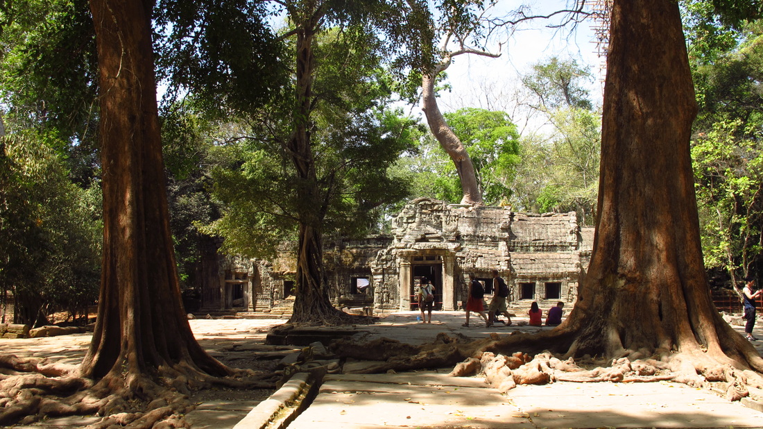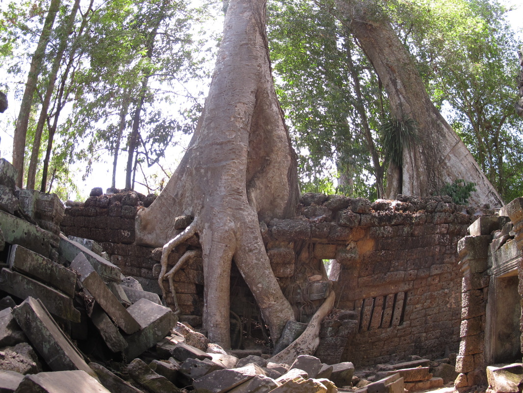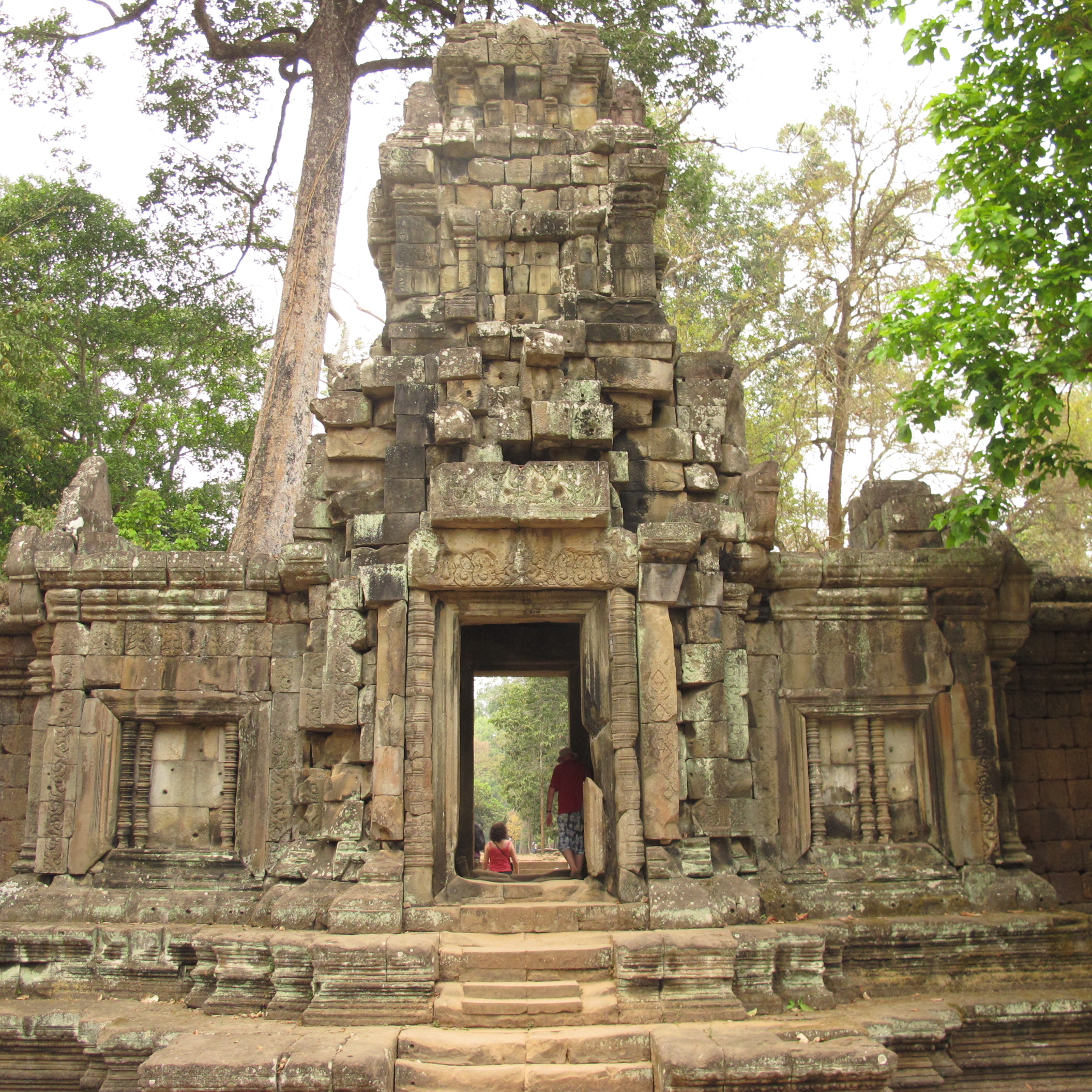 Preah Khan is a temple built in the 12th century for King Jayavarman VII. It is located northeast of Angkor Thom and would have housed a large amount of people inside its walls, estimated at 100,000. Like the nearby Ta Prohm, Preah Khan has been left largely unrestored, with numerous trees and other vegetation growing among the ruins.