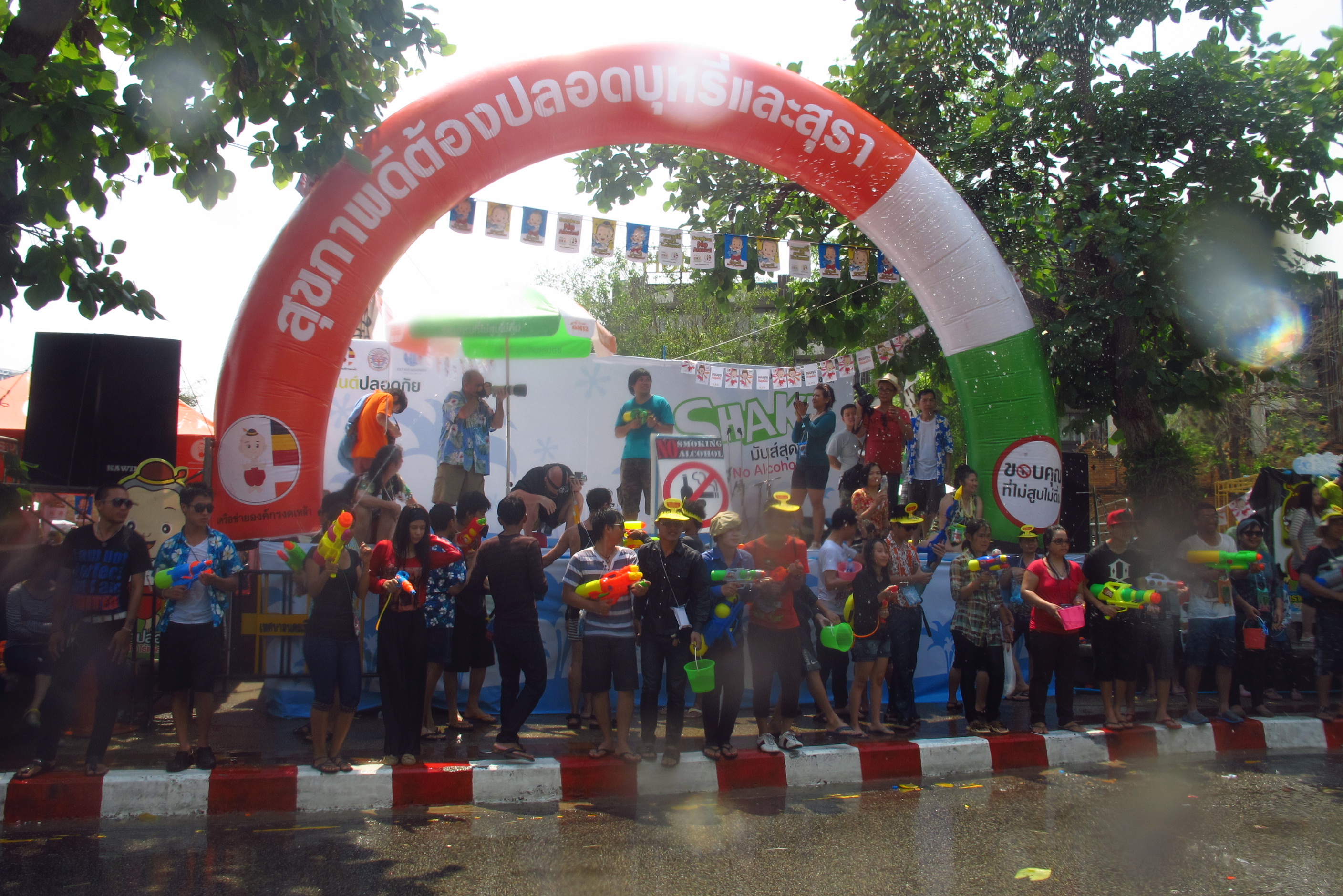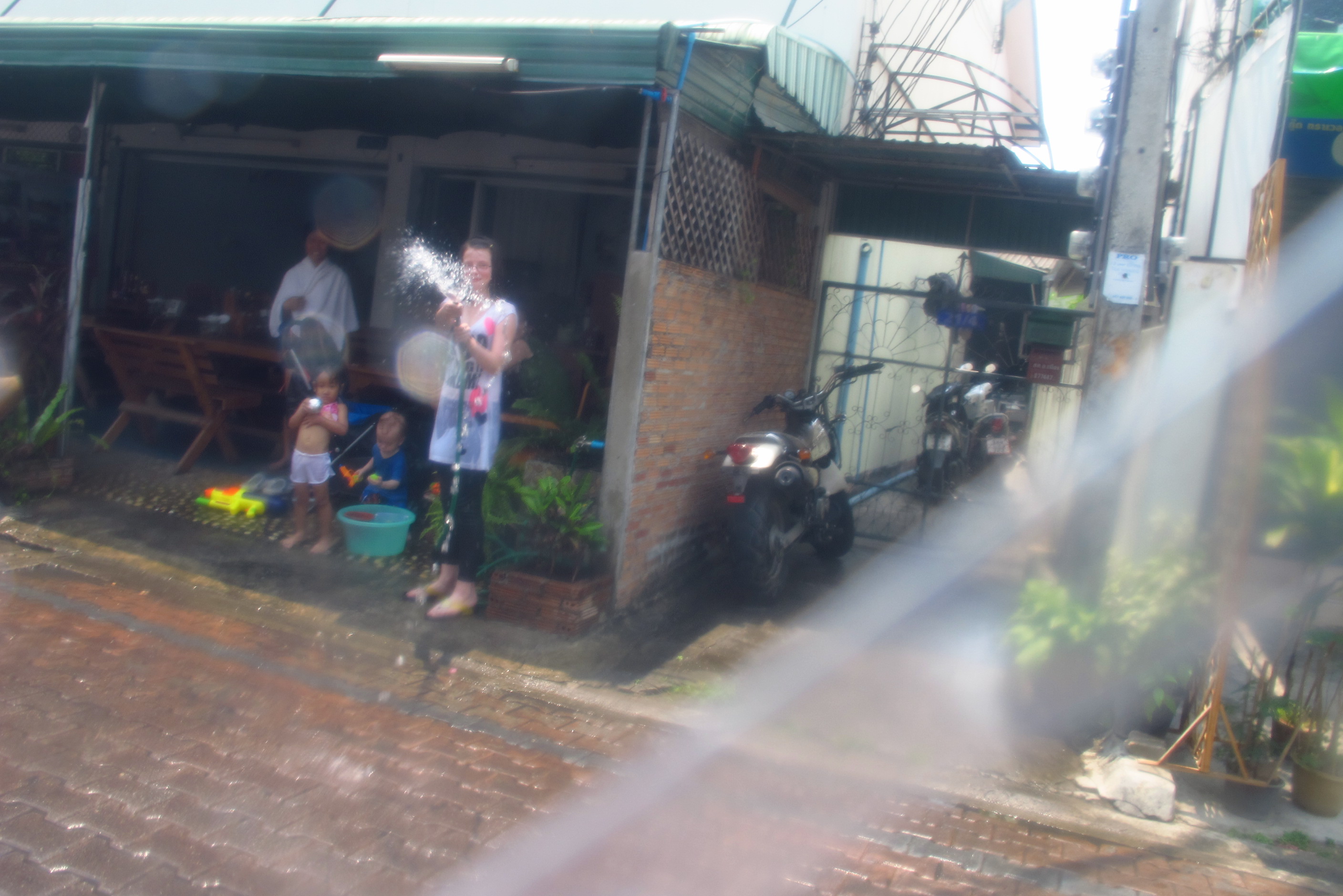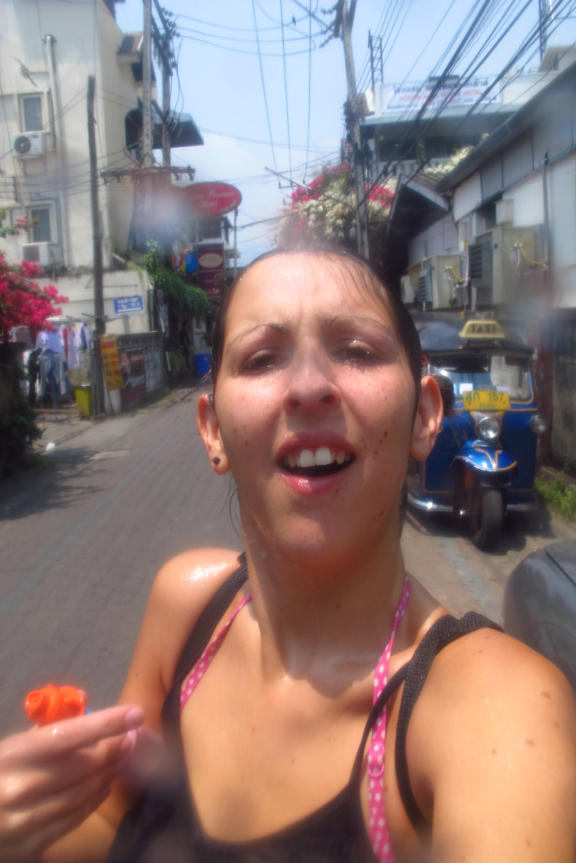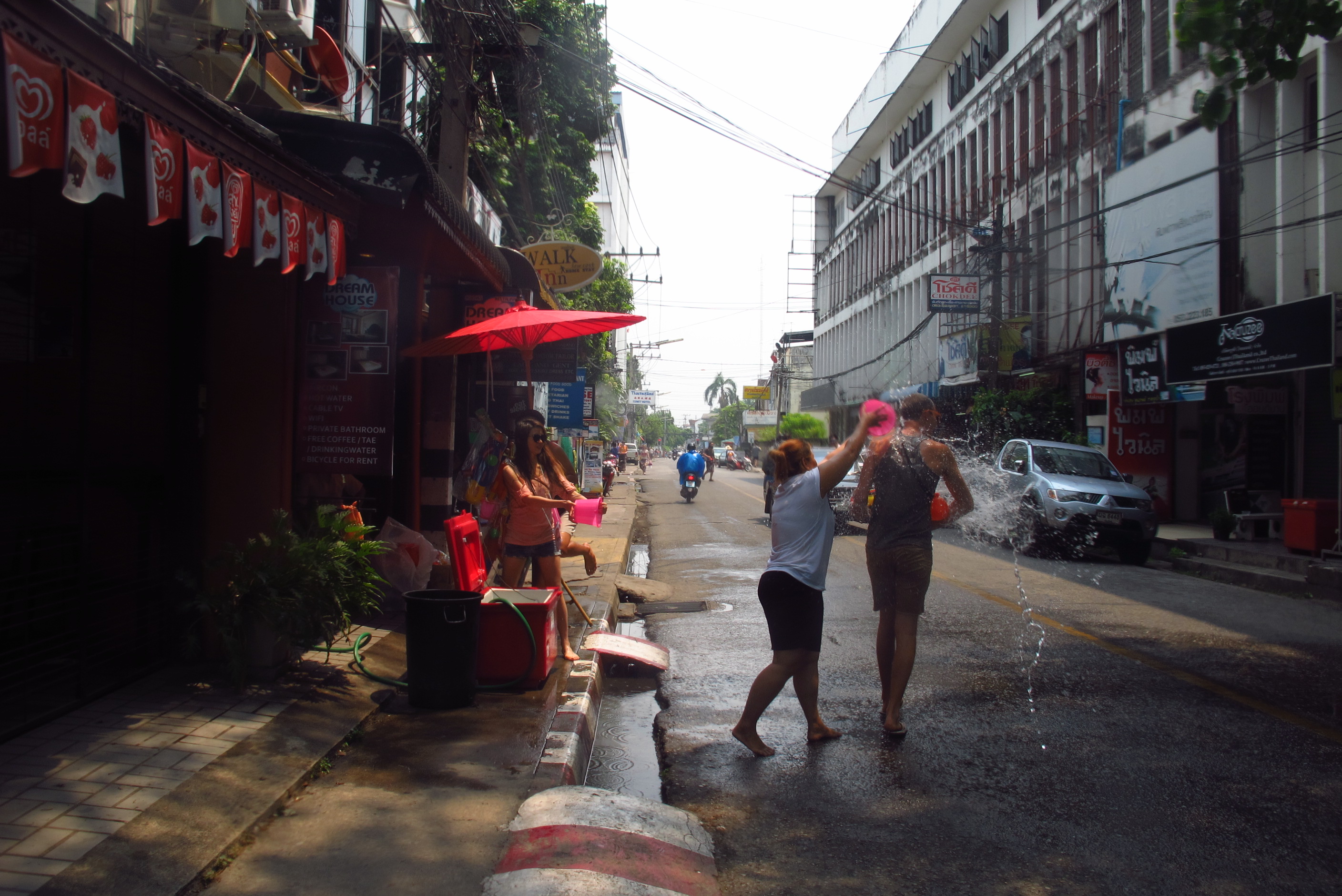 I am in Chiang Mai for the Festival, as I was told that this is THE place to be! It is amazing: there are stages set up around town and everyone is just throwing water over each other and going crazy! In the main part of the Old Quarter there have been large stages set up by some of the local airlines: Air Aisa and Bangkok Airways. They have various members of their staff (well I am guessing here, but they did look like Air Hostesses) standing on the stage and blasting the passers by with MASSIVE water cannons and hosepipes. It is brilliant! Everyone is soaked and everyone is involved somehow.