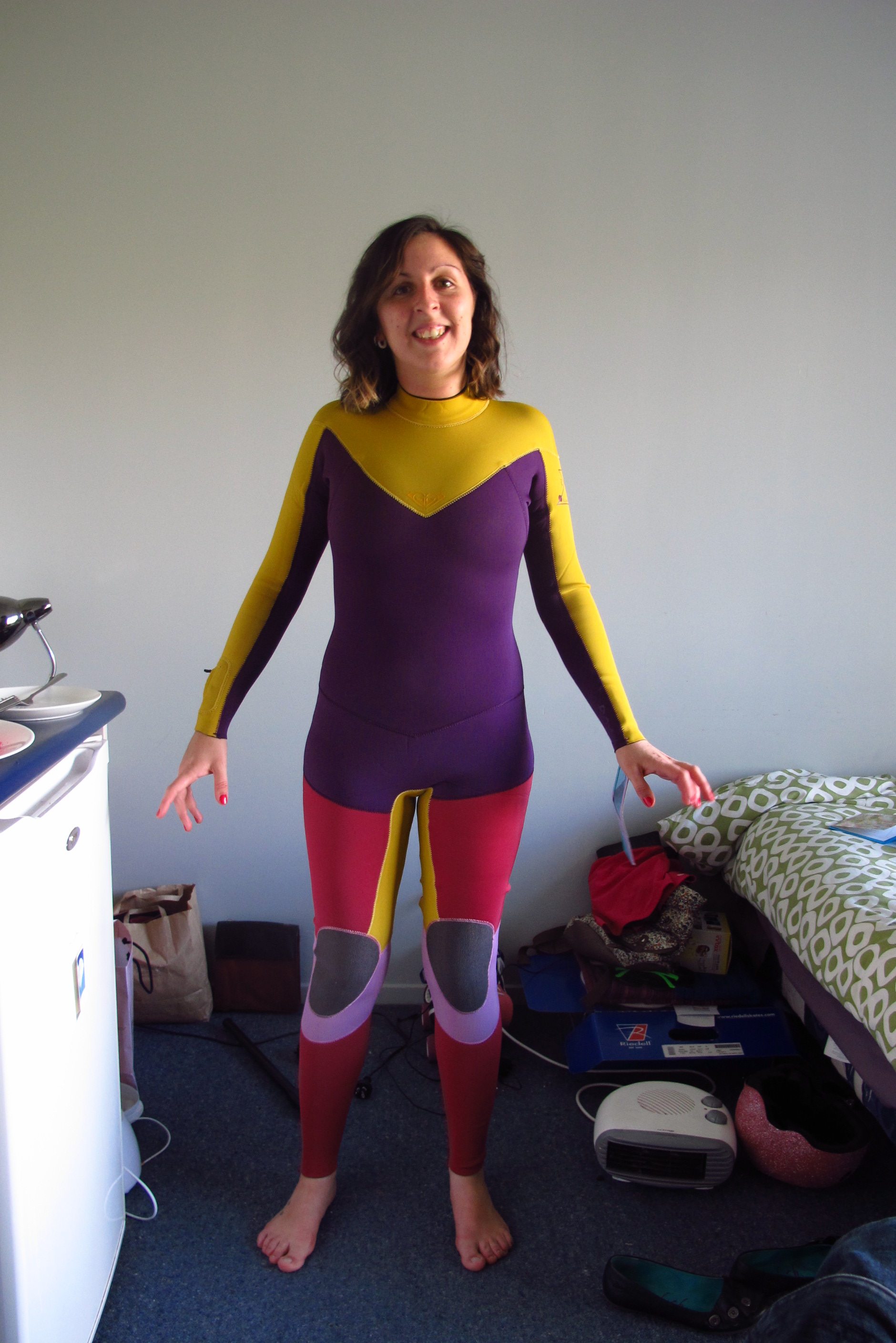 Upon arrival home after having my treats I noticed that there was a letter in the mail box and hoped that it was about the parcel from ‘Roxy’ that i’ve been waiting for. It was my brilliant new wetsuit, which comes in a rather fetching combination of Pink, Purple and Yellow, with snazzy knee pads!