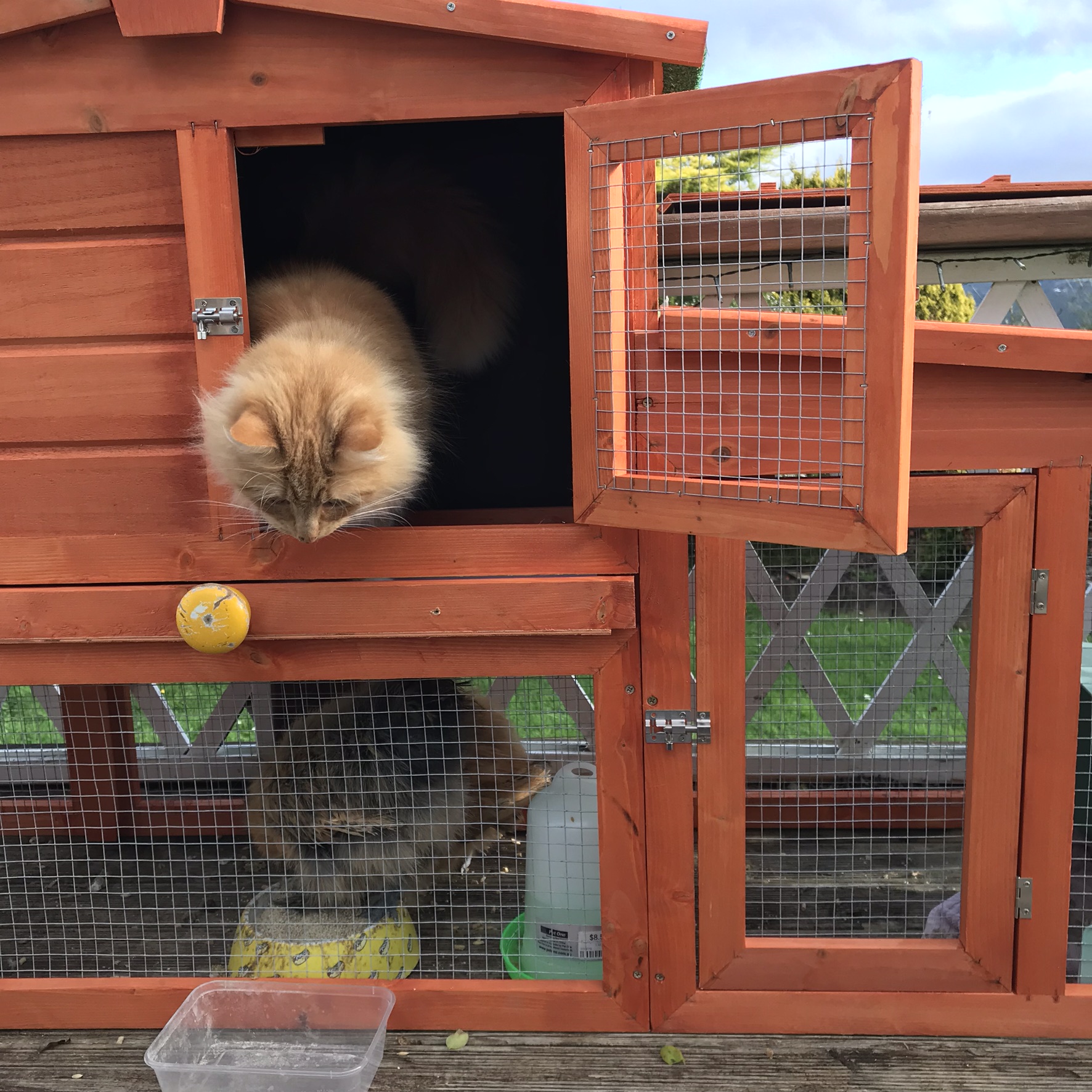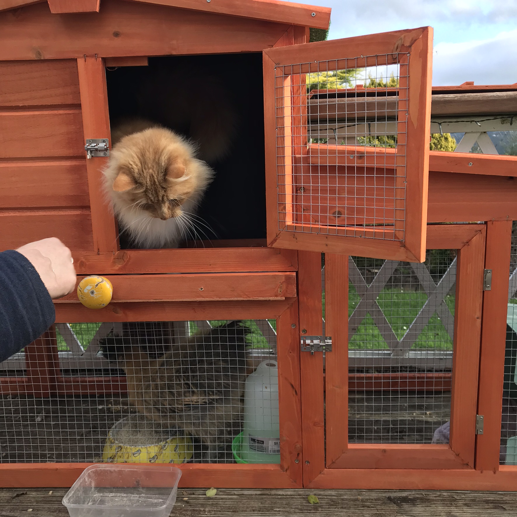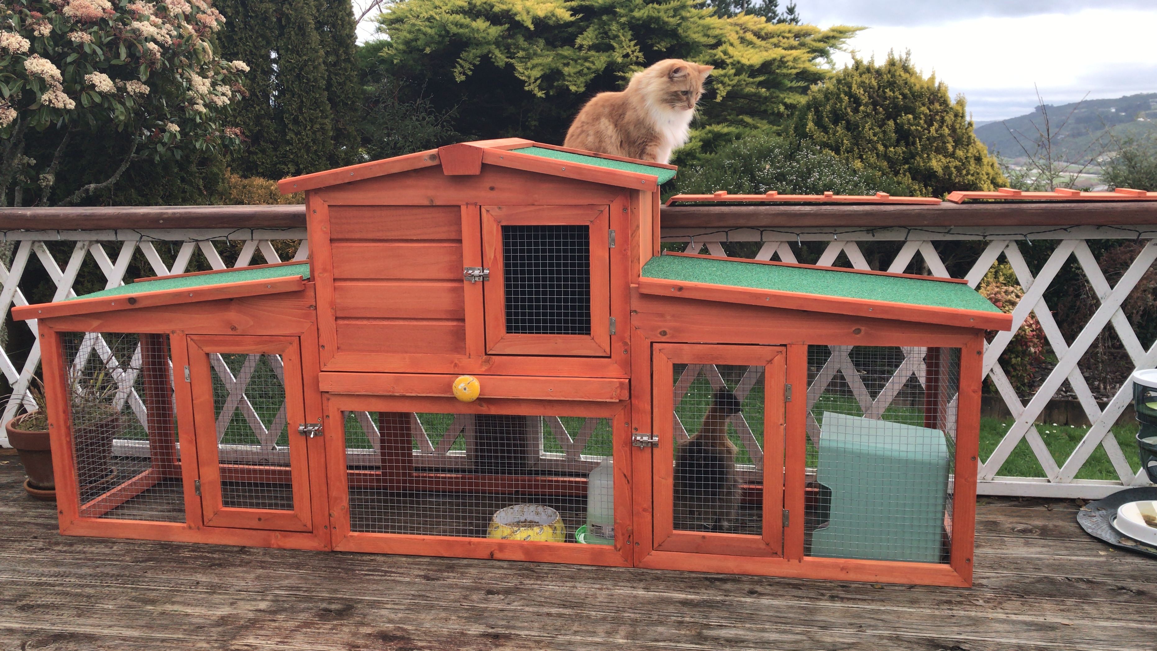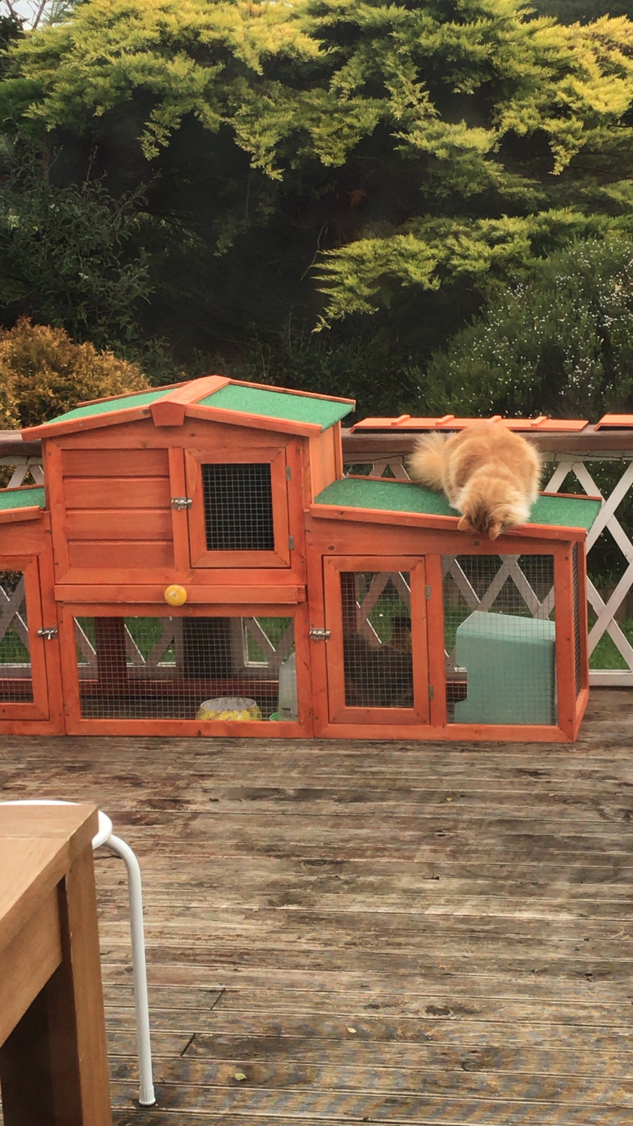 After Agatha’s approval we tried it on the deck to see if it would work, and to see if the chickens liked it…and would use it properly. We came to the conclusion that they couldn’t get up to the little room at the top, but other than that it seemed perfect for them.