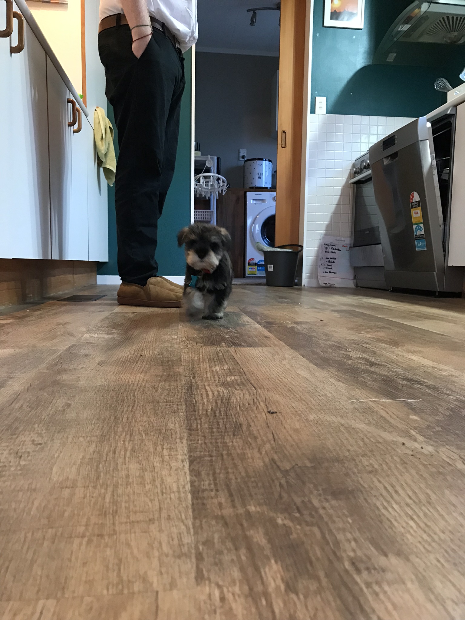 At first we set him up in the downstairs bathroom, with newspaper and his crate and bed. But then we felt bad and that he’d probably be lonely, so we moved him into a penned in area in the dining room. We felt bad leaving him there too, so we took him upstairs…but swiftly realised that wherever we put him he’s going to cry all night…so he went back down to the dining room and we hoped that he’d be okay.