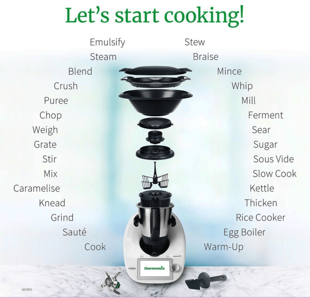 Thermomix is a kitchen appliance which basically does everything in the kitchen for you. In terms of functions, you get the ability to sear, chop, steam, stir, crush, grate, mix, emulsify, pulverise, whip, whisk and cook, all with precision temperature. Then it can also blend, caramalise, knead, ferment, warm up, slow cook, thicken, weigh, boil an egg, and cook your rice. All in the same appliance. Phew!
