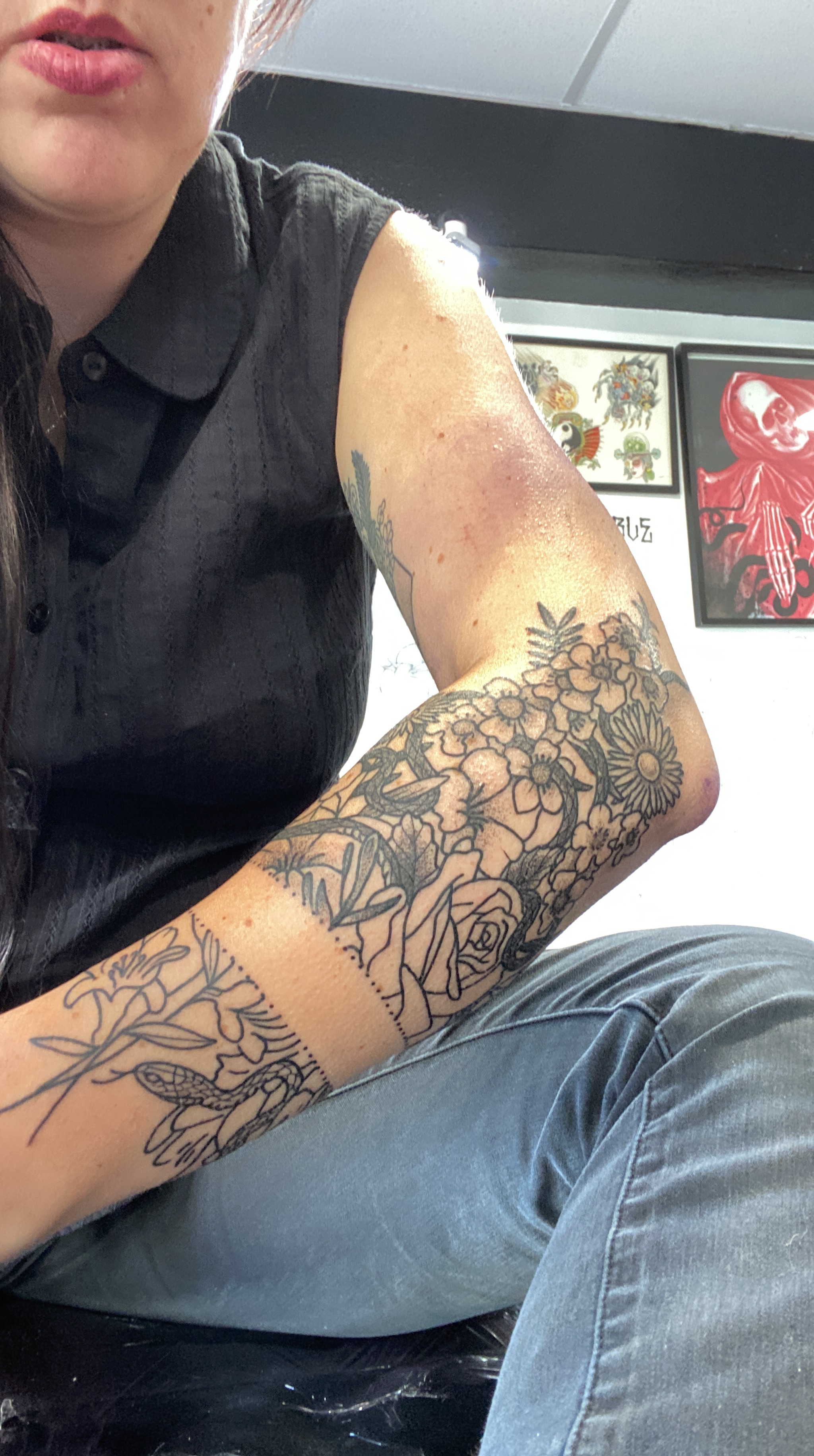 I decided to go with the same floral pattern that I have on my left bicep, but just a bit bigger. Once we’d decided on a location, it took about 5 hours. Which actually wasn’t that bad! The only bit that really bothered me was the elbow area. It was a bit ‘spicy’. Hahaha.